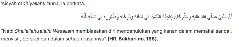 Jika kamu melepas pakaian akan lebih baik jika melepas yang sebelah kiri lebih dulu. Hal itu bisa kita lihat dari hadis berikut ini.