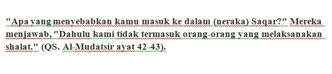 Penyesalan di akhirat tidak akan berguna, dan satu-satunya cara untuk menghindari konsekuensi ini adalah dengan taat menjalankan kewajiban sholat. Penjelasan terkait dimasukkan ke dalam neraka karena meninggalkan sholat, tertera dalam QS. Al-Mudatsir ayat 42-43.