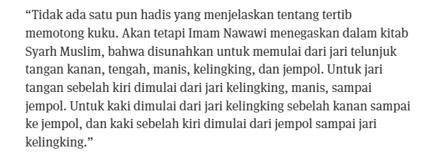 Dalam Kitab Fathul Bahari milik Imam Ibnu Hajar menjelaskan bahwa tidak ada hadits shahih mengenai detail urutan potong kuku. Hal ini berarti tuntunan serinci itu oleh Rasulullah SAW tidak ditentukan.